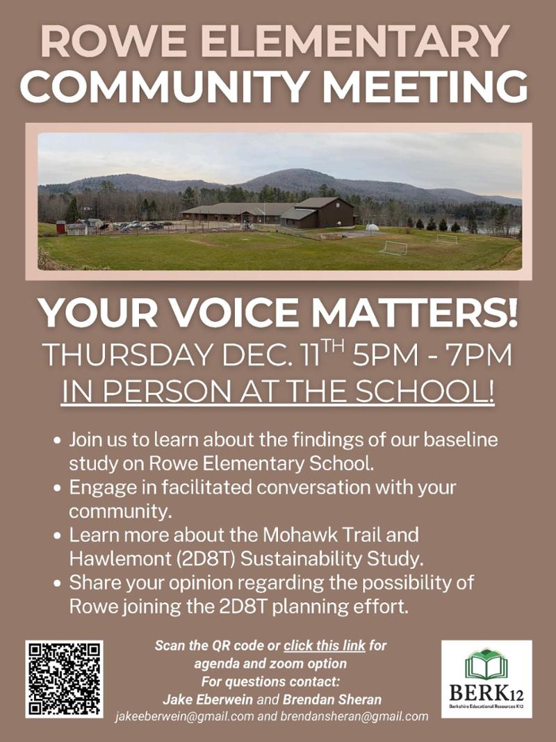 Rowe lies along the northern border of Franklin County western Massachusetts, bordered on the north by Whitingham, VT. Rowe, with a population of 424 citizens, has a total area of 24.0 square miles. It is nestled in an area of scenic beauty, with wooded mountains, clear brooks and the Deerfield River on its western border. Rowe is close to ski areas and enjoys great hiking, fishing, hunting, canoeing and kayaking. Rowe has its own elementary school for grades Pre-K to 6, a school of choice. Grades 7-12 attend the Mohawk Trail Regional High School or Franklin County Technical School.